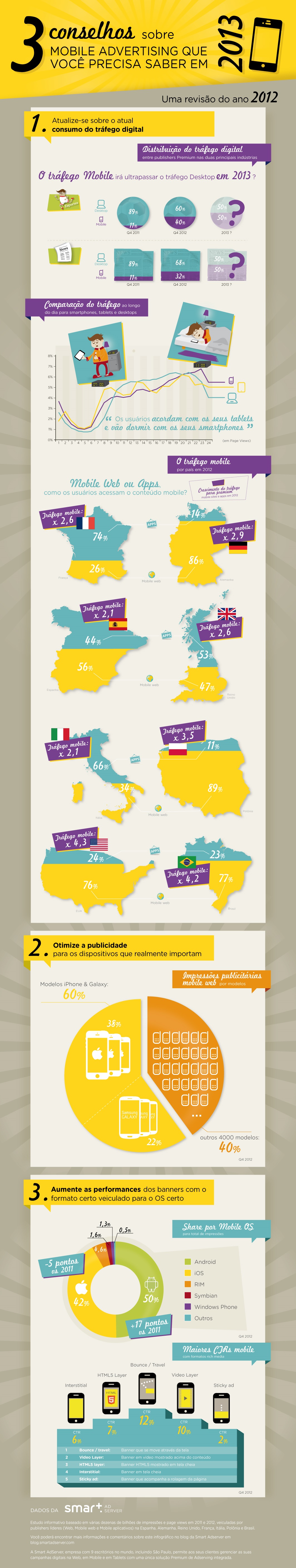 Vale acrescentar também, que o tráfego de mobile tem crescido em todo o mundo e no Brasil estima-se que tenha ultrapassado o tráfego desktop em 2013 na categoria esporte e notícias. Além disso, quando sua empresa for gerenciar uma campanha digital na WEB deverá prestar atenção para usar o formato correto dos banners para serem veiculados nos celulares e tablets, além dos desktops. Observe, no infográfico (IAB Brasil)  que anexei a este post, 03 conselhos sobre mobile advertising.